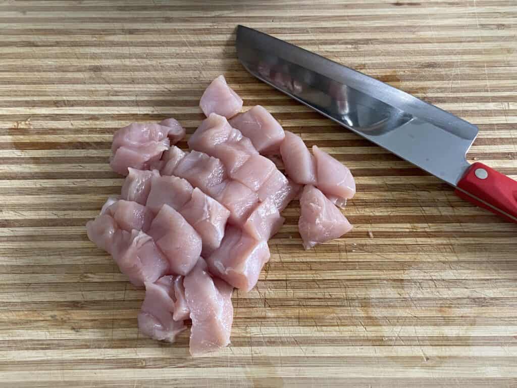 - Cut the chicken into bite-sized pieces.